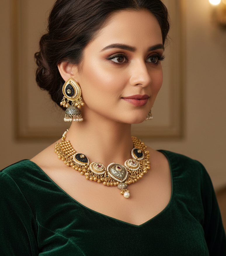 Regular price Rs. 170.00Regular priceUnit price / perRs. 340.00Sale price Rs. 170.00The "Midnight Clover" Onyx & Diamond Gold Necklace