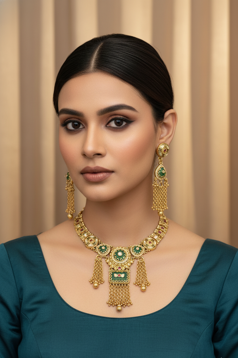 Immerse yourself in the opulent beauty of our "Heritage Cascade" Choker & Dangler Set. This exquisite necklace features a central rectangular pendant flanked by two round motifs, all adorned with intricate green enamel work, delicate white accents, and sparkling red stones. From these central elements, graceful gold chains cascade down, each ending with a tiny gold bead, creating a luxurious waterfall effect. The choker itself is intricately designed with studded segments and ornate patterns.