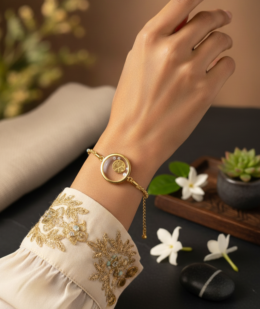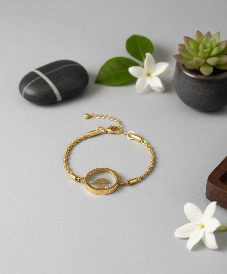 Golden braided bracelet with a clear locket and sparkling lucky charms. A chic everyday accessory