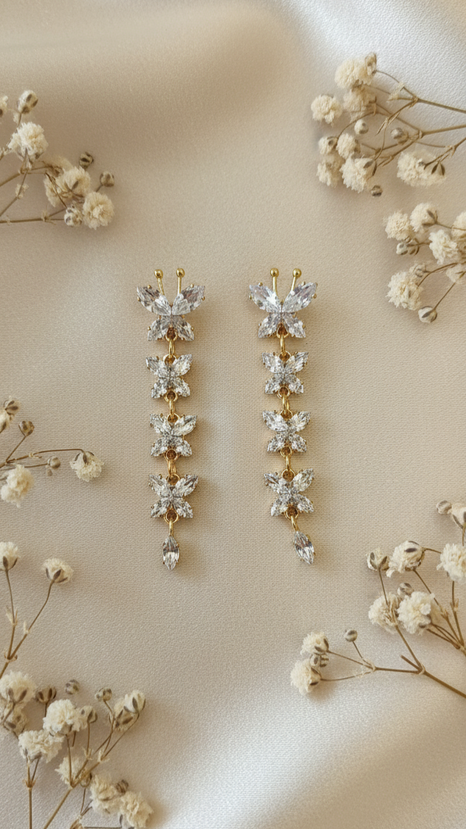 Embrace whimsical elegance with our 'Fluttering Cascade Butterfly Drop Earrings.' These enchanting earrings feature a delicate cascade of three sparkling butterflies, each meticulously detailed with brilliant clear crystals. Suspended from a radiant gold-toned chain, the design culminates in a petite, dazzling teardrop crystal that catches the light with every movement. Perfect for adding a touch of sophisticated charm to any outfit, these lightweight earrings are ideal for garden parties, romantic dinners, or simply to elevate your everyday sparkle. Let these beautiful butterflies flutter their way into your jewelry collection."