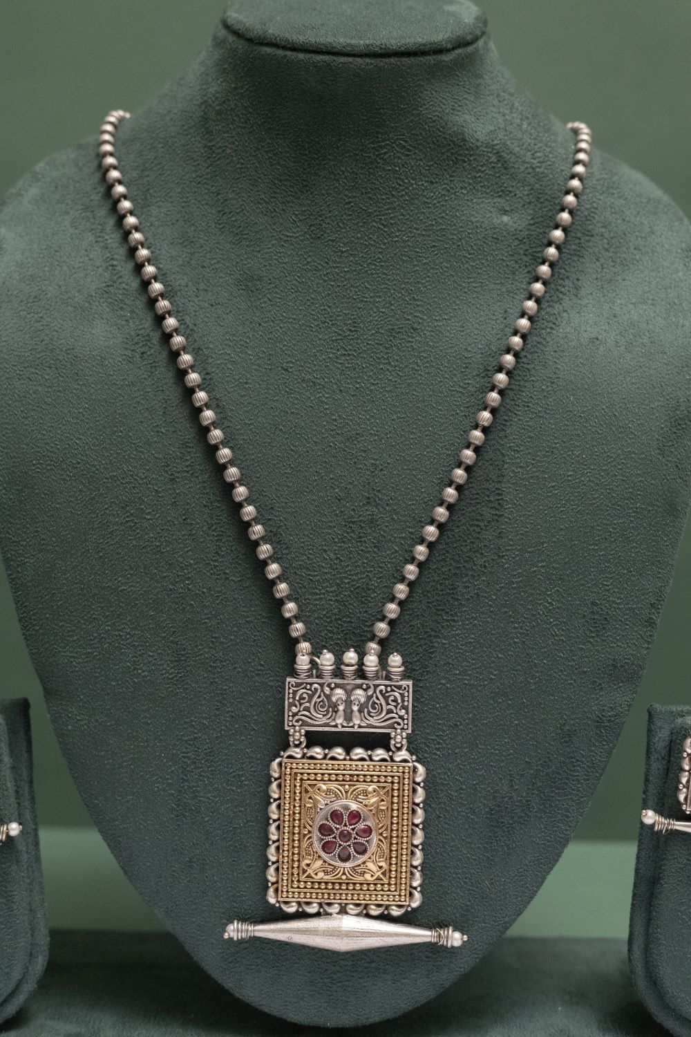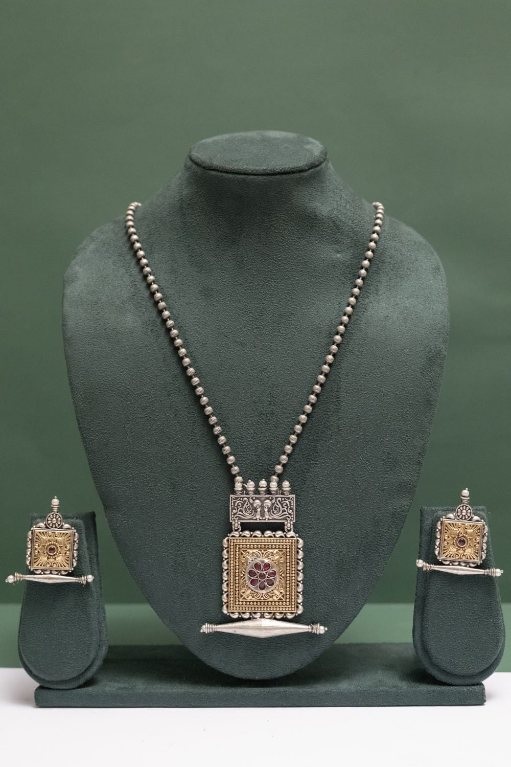 This striking necklace set features a dual-tone square pendant with intricate gold and oxidized silver detailing, cen...