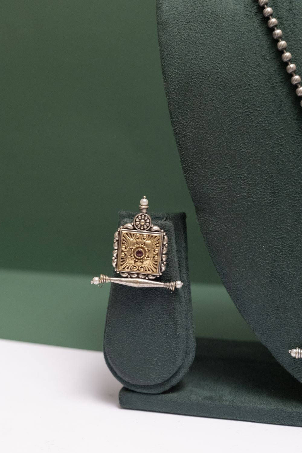 This striking necklace set features a dual-tone square pendant with intricate gold and oxidized silver detailing, centered with a delicate floral motif in deep red. The pendant’s ornate craftsmanship is beautifully complemented by matching square earrings, making this set perfect for adding a royal touch to traditional and festive attire. Its bold design and rich textures make it a timeless statement piece.