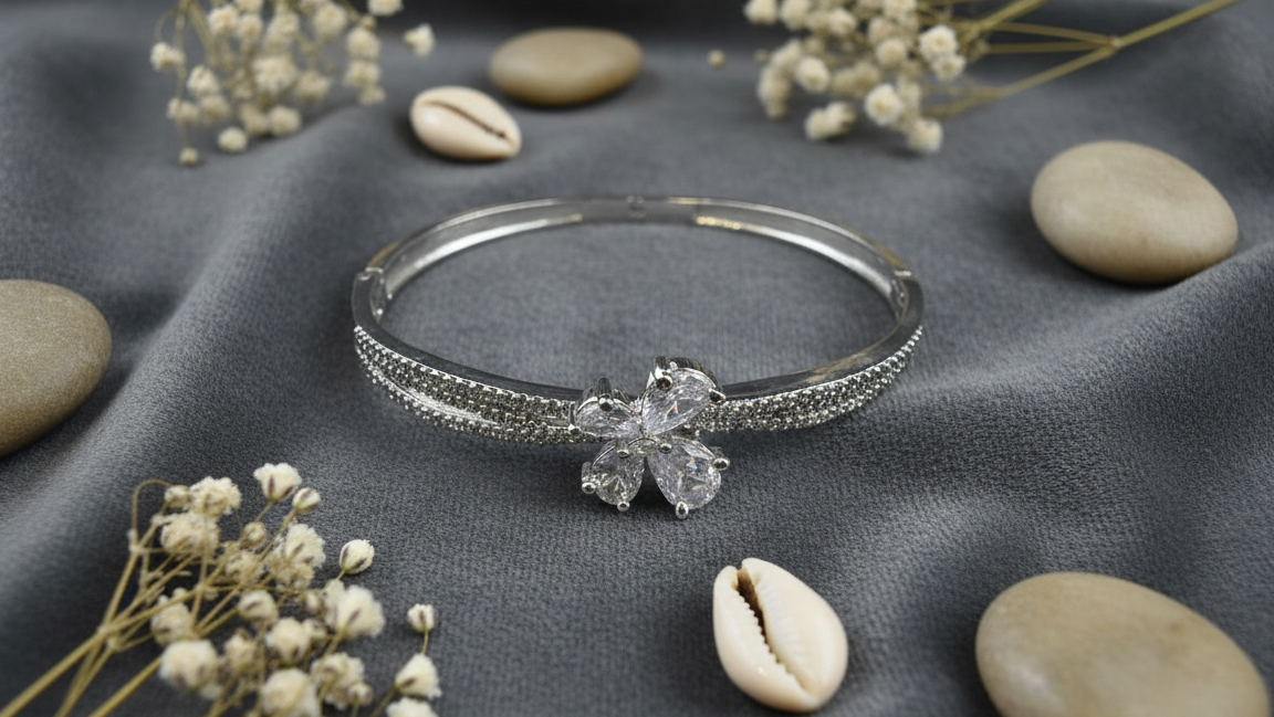 A sparkling silver-toned bracelet featuring a radiant central flower crafted from clear crystals, flanked by rows of shimmering pave stones. Elegant and eye-catching.