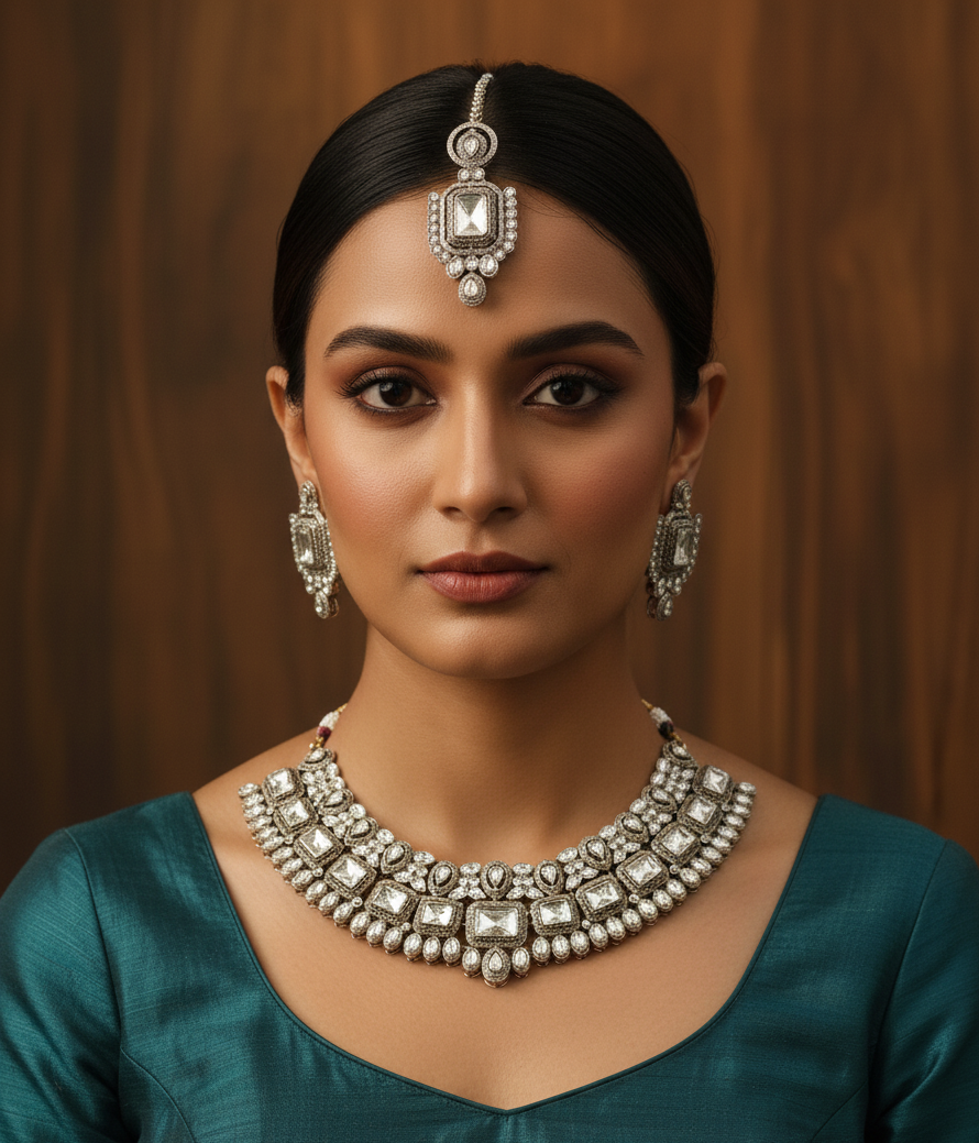 Step into an aura of magnificent brilliance with The Empress's Radiant Polki Set. This stunning jewelry ensemble is a true testament to grandeur, featuring a broad statement necklace, exquisitely matching earrings, and a delicate maang tikka. Each piece is intricately crafted with a captivating array of uncut Polki diamonds, carefully set to reflect light with breathtaking intensity.