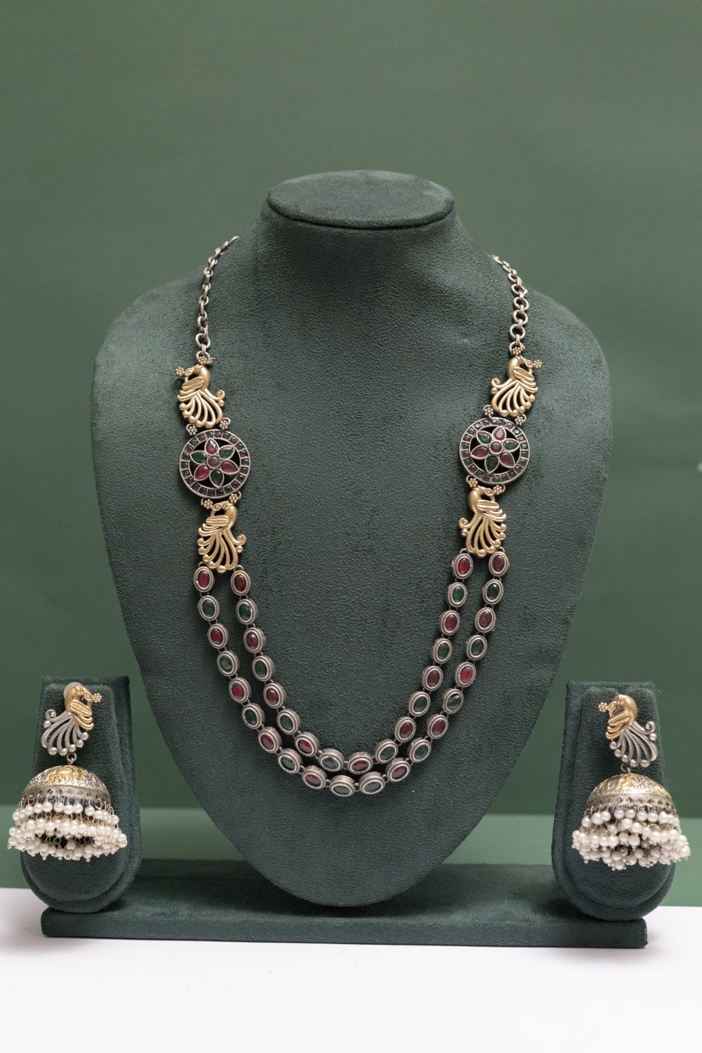 Elevate your traditional look with this antique silver necklace and jhumka set, featuring intricate peacock motifs and oxidized detailing. The dual-layered necklace is adorned with oval-shaped elements and circular floral accents, perfectly balanced with matching jhumkas embellished with pearl hangings. Ideal for festive occasions, weddings, or ethnic celebrations, this set offers timeless elegance and craftsmanship