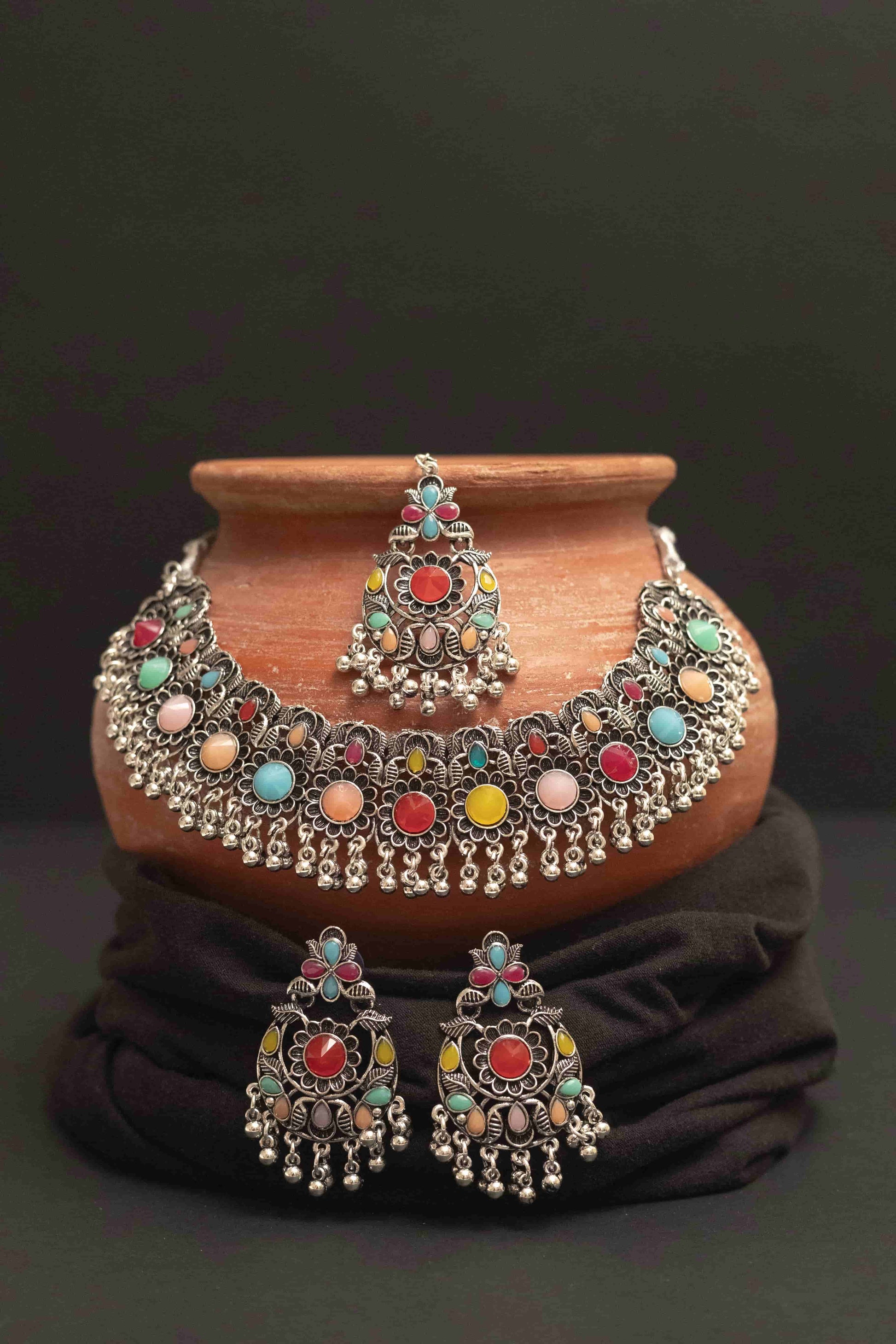 Add a pop of traditional charm to your collection with this Oxodise Meena Choker Necklace Set. Designed with intricate silver-tone oxidised detailing, the necklace is adorned with vibrant round cabochon stones in red, turquoise, yellow, and white tones. The matching earrings mirror the choker’s design, featuring delicate ghungroo danglers for added elegance. Perfect for ethnic outfits, festive events, or fusion wear, this lightweight yet eye-catching set makes a bold statement effortlessly.
