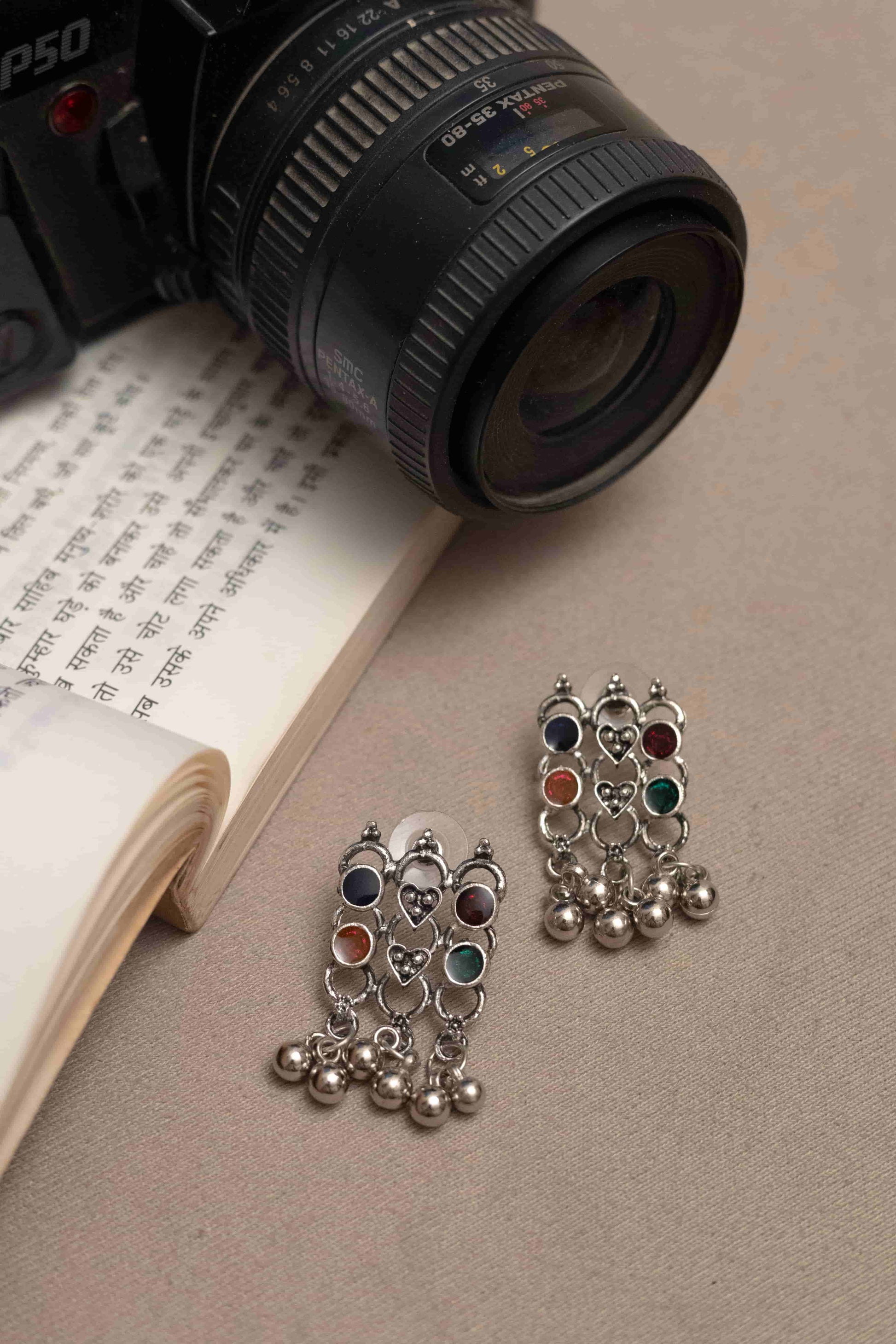 Showcase your love for traditional jewelry with this oxidized Meena necklace set. The colorful enamel work adds a vibrant touch to the vintage-inspired design.