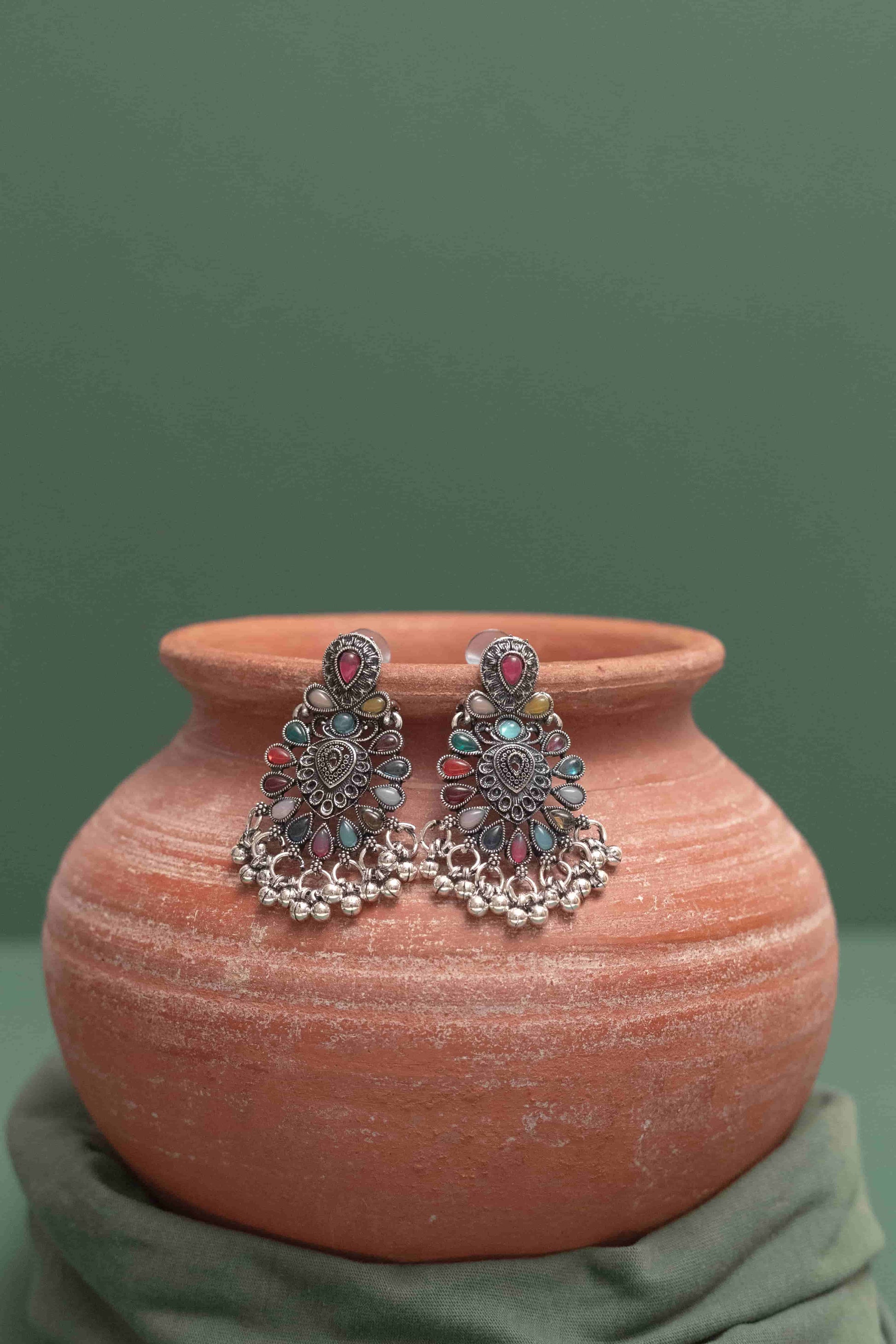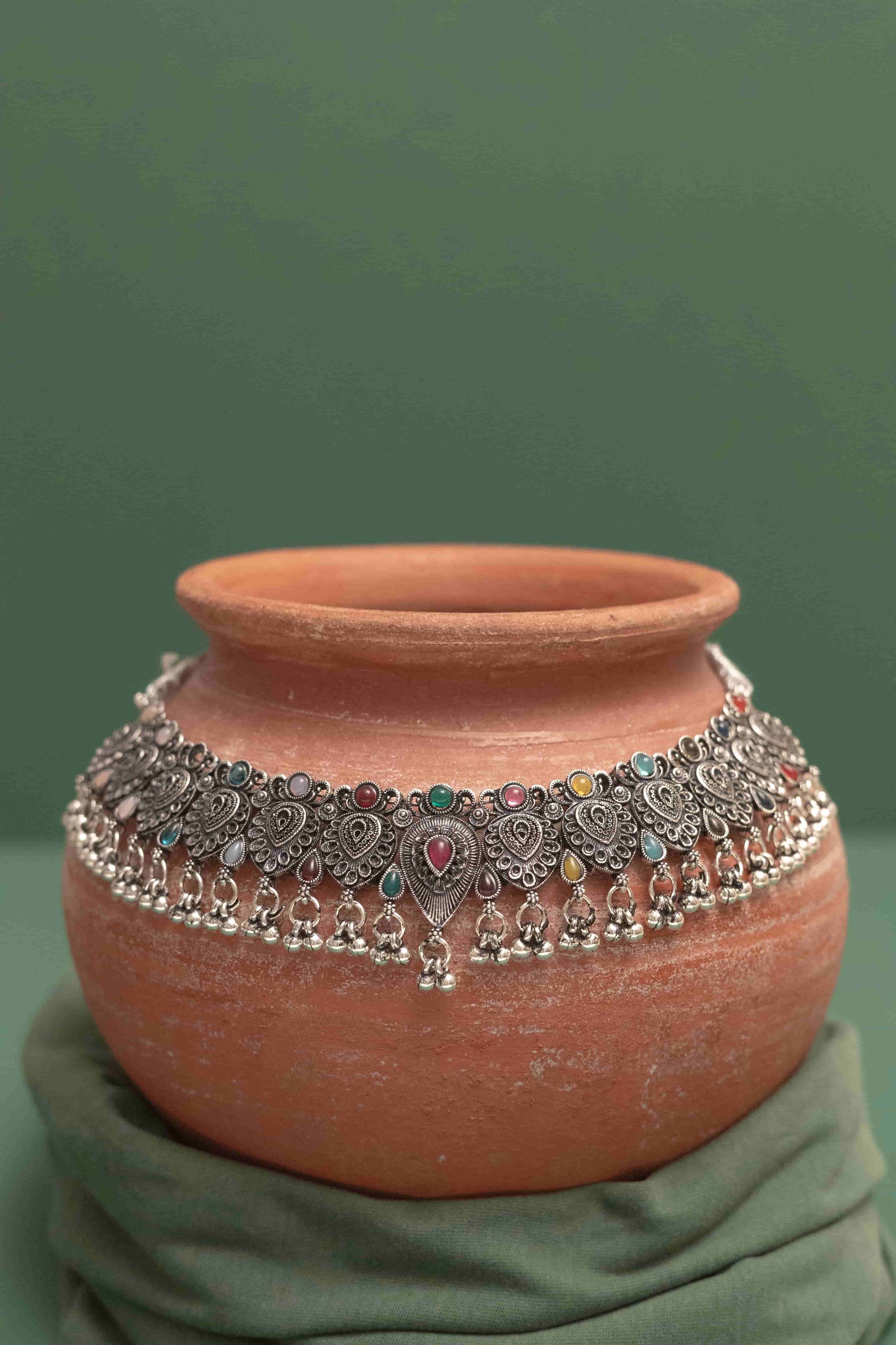 Oxidised Combo Multi Teardrop Choker Necklace with Cabochon Drops