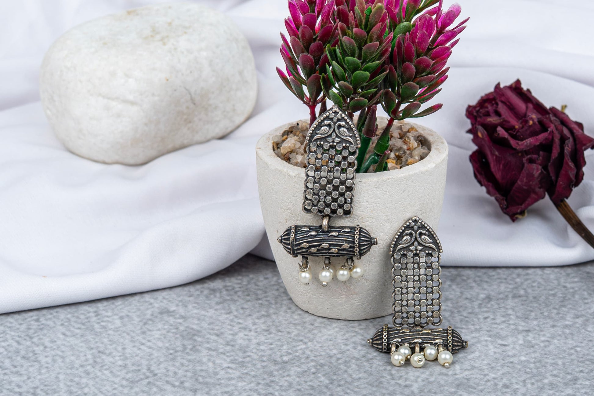 These German Silver long dangler earrings feature delicate pearl beads that add a touch of elegance to any outfit. Th...