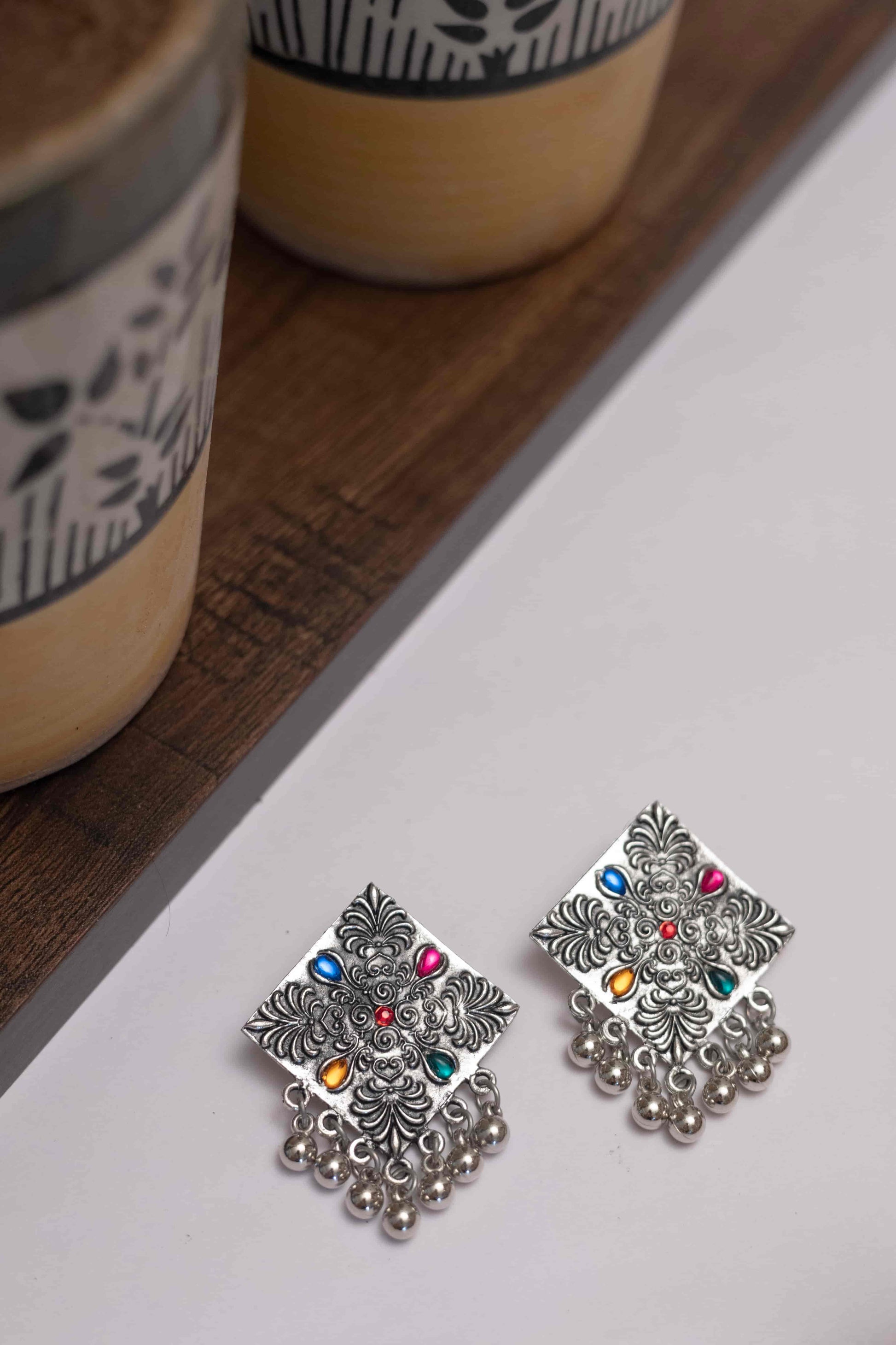 Exuding traditional elegance, this oxidised Meena necklace showcases a striking triangular pendant enriched with fine carvings and colourful enamel work. The long double-chain design, embellished with vibrant motifs, adds a regal touch, while the matching earrings complete the set’s graceful appeal. Perfect for festive occasions, weddings, and cultural gatherings, this antique silver-finished piece pairs effortlessly with sarees, lehengas, and other ethnic outfits, making it a captivating addition to your jewellery collection.